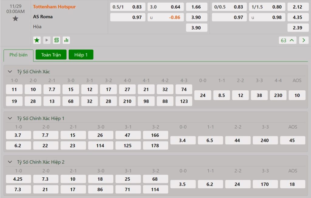 Bảng cập nhật tỷ lệ kèo nhà cái trận Tottenham vs AS Roma