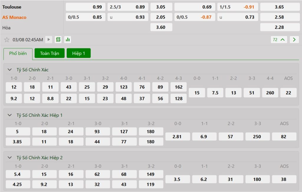 Bảng cập nhật tỷ lệ kèo nhà cái trận Toulouse vs AS Monaco