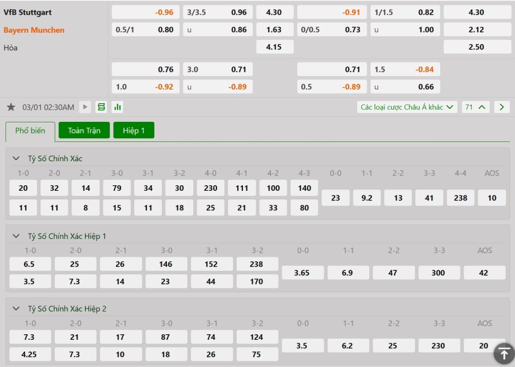 Bảng cập nhật tỷ lệ kèo nhà cái trận VfB Stuttgart vs Bayern Munich