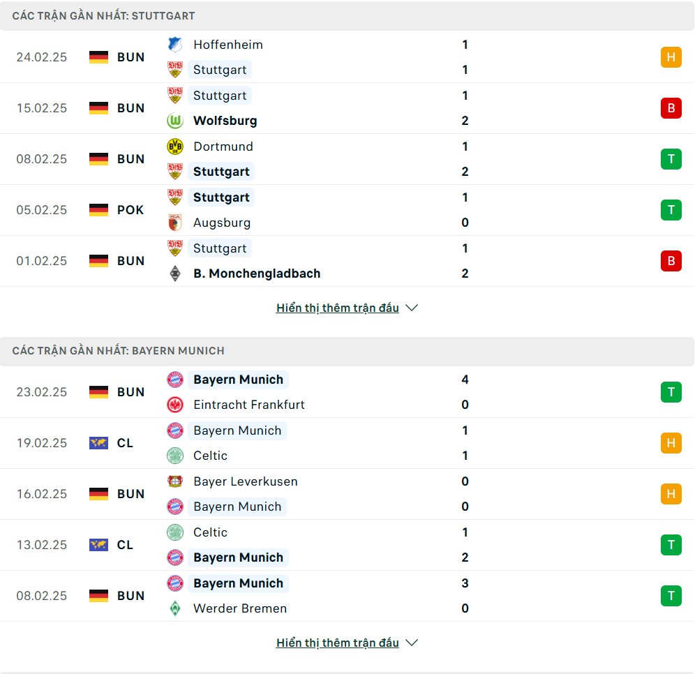 Thống kê phong độ gần đây & thành tích đối đầu VfB Stuttgart vs Bayern Munich