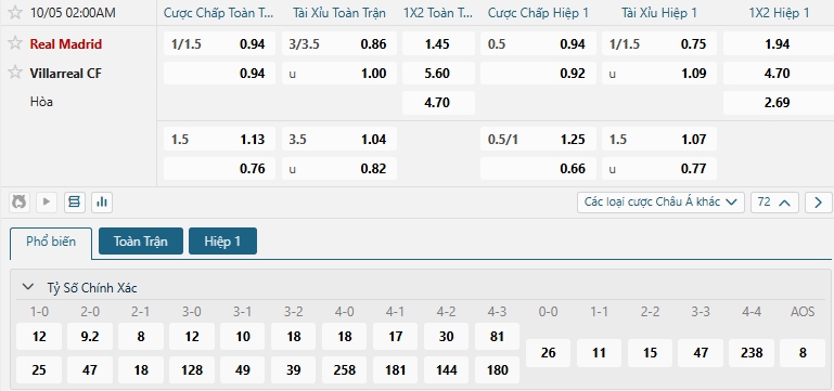 Nhà cái châu Á đang đánh giá cao khả năng chiến thắng của chủ nhà Real Madrid là cao hơn nhiêu , khi đưa ra mức chấp đang là 1.25, Real Madrid với ưu thế sân nhà, thực lực vượt trội cùng phong độ ấn tượng sẻ là đội được dự đoán có cho mình chiến thắng, dù đối thủ Villarreal cũng đang chơi cực kỳ tốt, nhưng trước một Real Madrid được đánh giá cao thì khó lòng để Villarreal có thể giữ điểm số, trong 3 chiến thắng gần nhất của Real Madrid trước Villarreal thì Real Madrid có 2 lần tạo chiến thắng cách biệt, lựa chọn Real Madrid cho kèo châu Á.