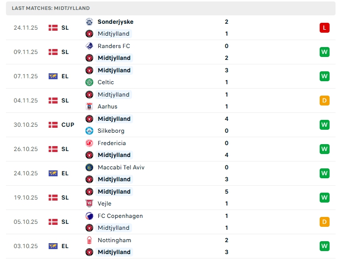 Midtjylland là đại diện đến từ Đan Mạch, sau 4 lượt trận hàng công mang về 11 bàn thắng, cùng hàng thủ nhận 3 bàn thua, 3/4 trận đấu đó của Midtjylland khép lại từ 3 bàn trở lên, hàng công cũng là điểm mạnh của Midtjylland , khi xa nhà ở 3/5 trận gần nhất cũng vượt mốc trên 3 bàn.