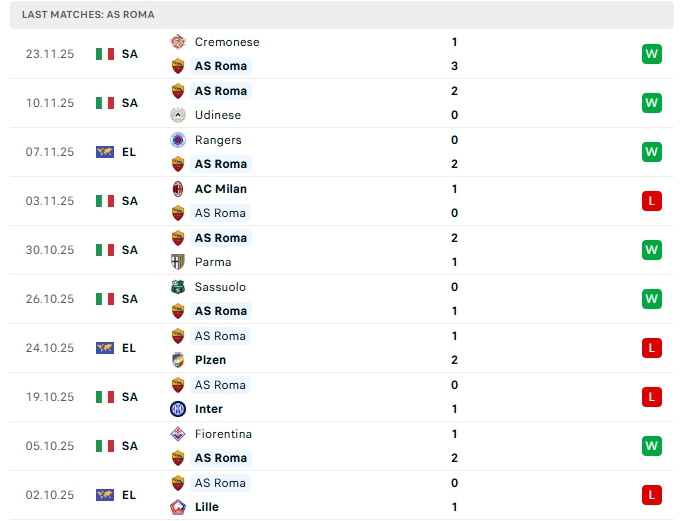 Roma sau 4 lượt trận đại diện Italia có được 5 bàn thắng trong đó hàng thủ nhận 4 bàn thua, 2/3 trận đấu đó khép lại không quá 2 bàn thắng, trên sân nhà của mình ở 3/5 trận vừa qua khép lại không quá 2 bàn.