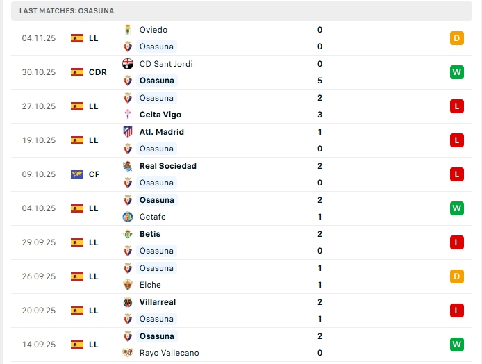 Osasuna ở 11 vòng đấu, hàng công mang về 9 bàn thắng cùng hàng thủ nhận 12 bàn thua, 42/3 trận đấu vừa qua khép lại từ 3 bàn trở lên, khi thi đấu xa nhà Osasuna thường nhập cuộc chặt chẻ, dù vậy 3/5 trận gần nhất họ đều để các đối thủ chọc thủng lưới.