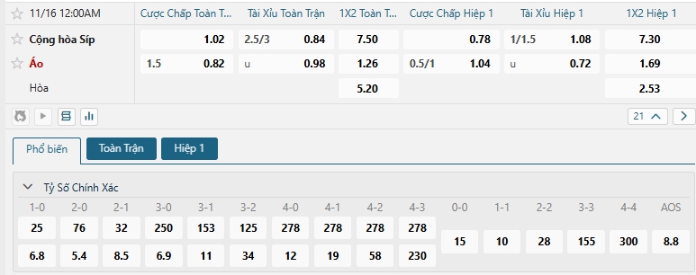 Bảng tỷ lệ kèo bóng đá trận đấu Síp vs Áo