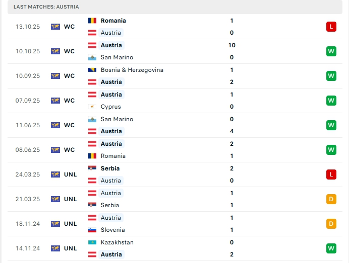 Bên kia sân, Áo sau 6 lượt trận, đội bóng này có được 5 chiến thắng cùng 1 thất bại, có được 15 điểm và đang dẫn đầu trên BXH, ở trận gần nhất Áo bất ngờ nhận thất bại 0-1 trước Romania, thất bại này chấm dứt chuỗi 5 chiến thắng liên tiếp, khi xa nhà Áo thắng 3 và thua 2 ở 5 trận vừa qua.