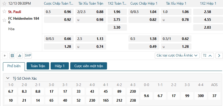 Bảng tỷ lệ kèo bóng đá trận đấu St. Pauli vs Heidenheim