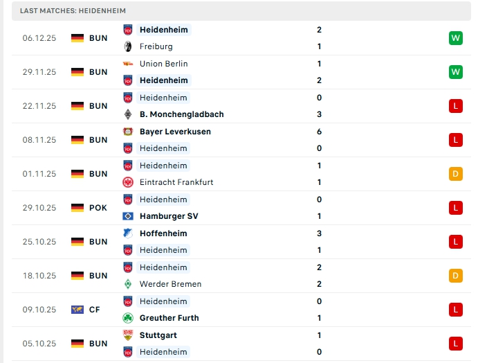 Bên kia sân, Heidenheim sau 13 trận đấu, đội bóng này có cho mình 3 chiến thắng, 2 hòa cùng 8 thất bại, có được 11 điểm và đang xếp thứ 16 trên BXH,  ở vòng đấu gần nhất Heidenheim có chiến thắng 2-1 trước Freiburg, đây là chiến thắng thứ 2 của họ ở 2 vòng gần nhất, phong độ thời gian qua của Heidenheim có chiều hướng cải thiện, dù vậy khi xa nhà, đội bóng này đang chơi tệ khi chỉ thắng 1 ở 5 trận gần nhất.