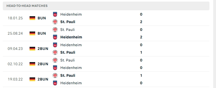 Những màn đụng độ giữa St. Pauli và Heidenheim thường diễn ra chặt chẻ với ít bàn thắng được tạo ra, cụ thể ở 5 lần gặp nhau gần nhất của hai đội và 4/5 lần đón tiếp Heidenheim trên sân của St. Pauli  khép lại không quá 2 bàn.