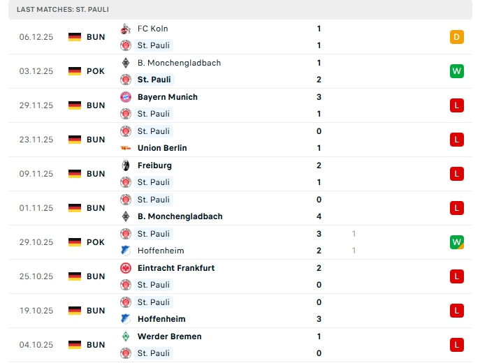 St. Pauli sau 13 vòng đấu, đội bóng này mang về 2 chiến thắng, 2 hòa cùng 9 thất bại, có được 8 điểm và đang xếp vị trí thứ 11 trên BXH, ở vòng đấu gần nhất St. Pauli có trận hòa trước FC koln, đây là trận không thắng thứ 10 liên tiếp của đội bóng này, phong độ thời gian qua của St. Pauli là không tốt, trên sân nhà St. Pauli cũng đang chơi tệ khi thua 4 trận ở 4 vòng gần nhất.