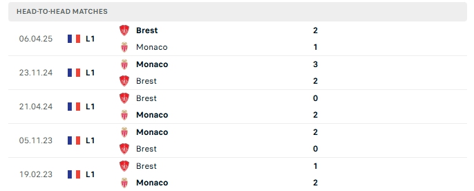 Quá khứ đối đầu Stade Brestois vs Monaco