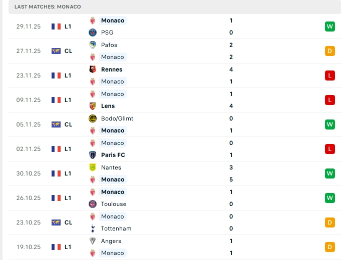Phong độ thi đấu gần đây Stade Brestois vs Monaco