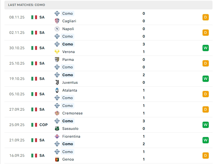 Como sau 11 trận đấu, đội bóng này mang về 12 bàn thắng cùng hàng thủ nhận 6 bàn thua, 4/5 trận gần nhất của Como khép lại không quá 2 bàn thắng, khi thi đấu xa nhà ở 4/5 trận gần nhất khép lại với kết quả tương tự, việc hàng thủ đang chơi chắc chắn giúp Como đang có những trận đấu ấn tượng.