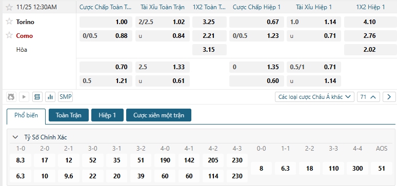Kèo tỷ số trận Torino vs Como