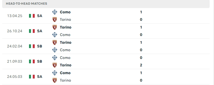 Những màn đụng độ giữa Torino và Como thường diễn ra chặt chẻ với ít bàn thắng được tạo ra, cụ thể ở 5 lần gặp nhau gần nhất và 3/5 lần đón tiếp Como trên sân của Torini khép lại không quá 2 bàn thắng.