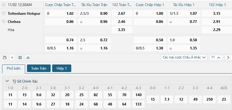 Kèo tỷ số trận Tottenham vs Chelsea
