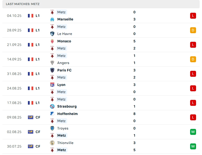 Metz sau 7 trận đấu hàng công đội bóng này chỉ mang về 5bàn thắng, bên cạnh hàng thủ thiếu chắc chắn khi nhận đến 16 bàn thua, 3/5 trận vừa qua của Metz khép lại trên 3 bàn, khi thi đấu xa nhà ở 4/5 trận cũng có kết quả tương tự, hàng thủ đang là điểm yếu khiến Metz dễ dàng bị các đối thủ khai thác.