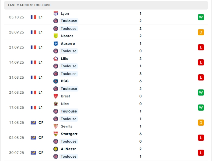 Toulouse sau 7 trận đấu họ có được 3 chiến thắng và 1 hòa và 3 thất bại, mang về 10 điểm và đang xếp ở vị trí thứ 9 trên BXH, phong độ thời gian qua của Toulouse là không tốt, đội bóng này chỉ thắng 1 ở 5 trận gần nhất, cùng với 1 hòa và 3 thất bại, trên sân nhà Toulouse cũng chỉ có 1 chiến thắng ở 5 trận vừa qua.
