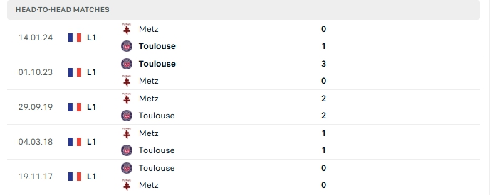 2/3 lần gặp nhau gần nhất của hai đội và 3/5 lần đón tiếp Metz trên sân của Toulouse khép lại từ 3 bàn trở lên, một trận đâu hứa hẹn với nhiều bàn được tạo ra.