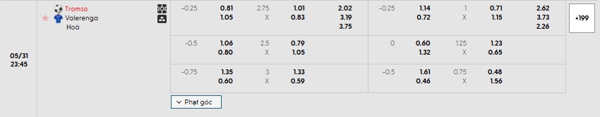 Bảng tỷ lệ kèo bóng đá trận đấu Tromso vs Vaalerenga
