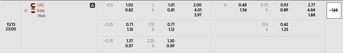 Bảng tỷ lệ kèo bóng đá trận đấu UAE vs Iraq