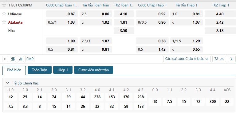 Bảng tỷ lệ kèo bóng đá trận đấu Udinese vs Atalanta