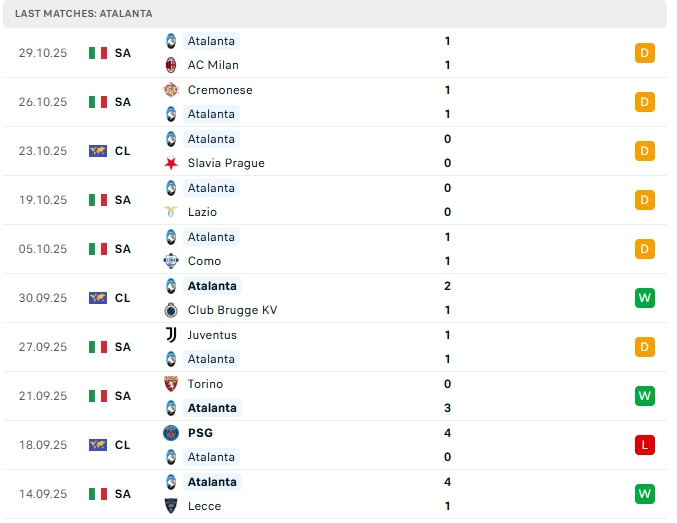 Atalanta sau 9 trận đấu này, đội bóng này mang về 13 bàn thắng cùng hàng thủ nhận 7 bàn thua, lối chơi của Atalanta ở mùa giải năm nay khá chắc chắn, họ thường nhập cuộc chậm và chắc, hàng thủ đang là điểm mạnh của đội bóng này, cả 5 trận gần nhất của Atalanta khép lại không quá 2 lần lưới rung, khi thi đấu xa nhà ở 3/5 trận vừa qua cũng có kết quả tương tự.