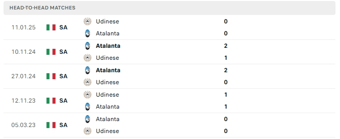Những màn đụng độ giữa Udinese và Atalanta thường diễn ra chặt chẻ với ít bàn thắng, cụ thể ở 4/5 lần gặp nhau gần nhất và 3/5 lần đón tiếp Atalanta trên sân của Udinese cũng khép lại không quá 2 lần lưới rung.