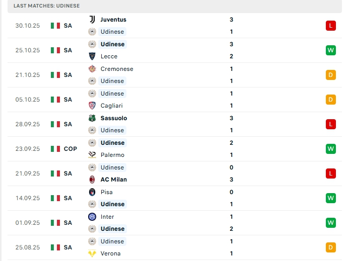 Phong độ thi đấu gần đây Udinese vs Atalanta
