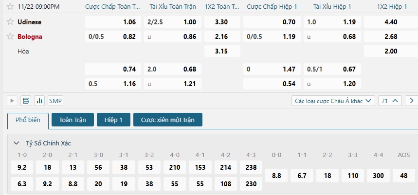 Bảng tỷ lệ kèo bóng đá trận đấu Udinese vs Bologna