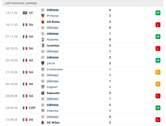 Udinese sau 11 trận đấu họ mang về 15 điểm với 4 chiến thắng, 3 hòa và 4 thất bại, đang xếp vị trí thứ 10 trên BXH, ở vòng đấu gần nhất, Udinese nhận thất bại 0-2 trước Roma, đây là thất bại thứ 2 ở 3 vòng, trên sân nhà của mình Udinese đang chơi tốt với chuỗi 5 trận bất bại liên tiếp với 4 chiến thắng cùng 1 hòa.